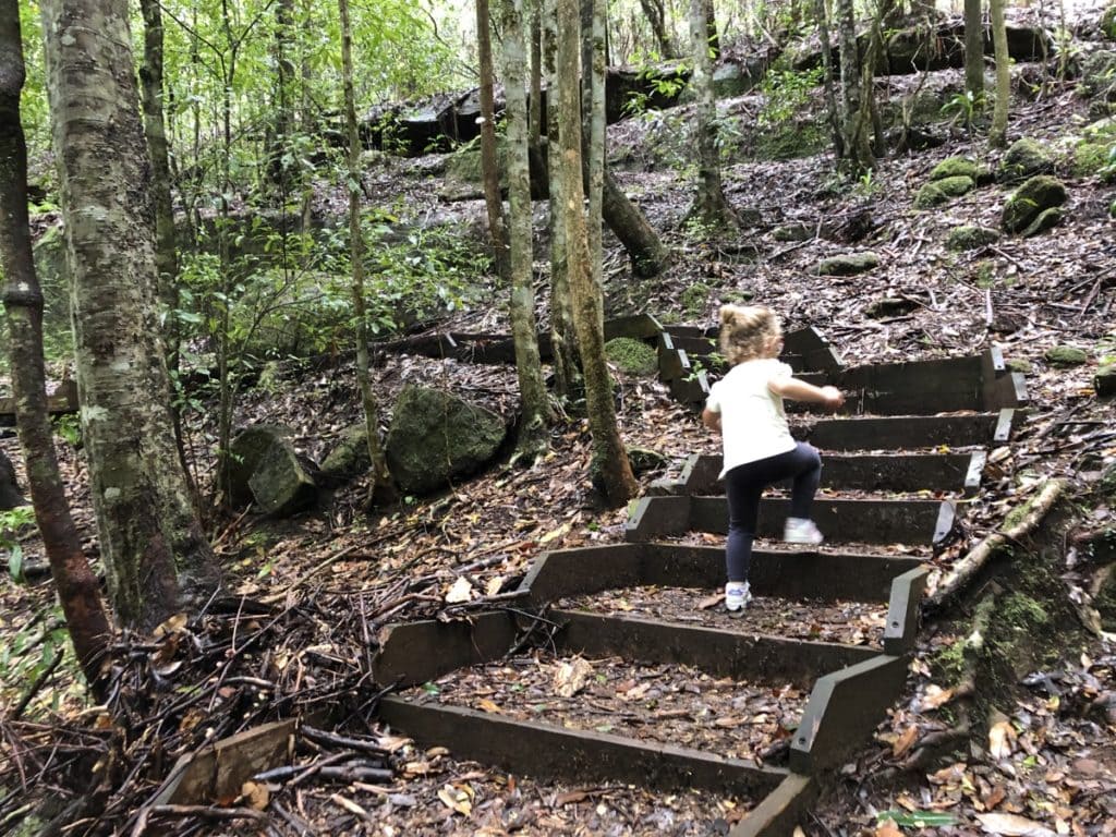 You can follow the leafy path as it winded deep into the rainforest up and down rocky stairs, past moss green trees, and tree stumps until you reach the creek.