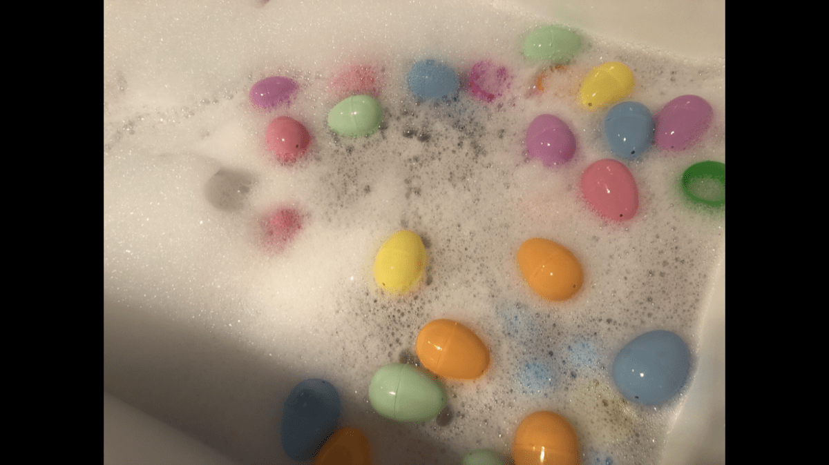 Another great activity for the little ones- simply fill a tray, bath-tub or splash pool with water and lots and lots of plastic Easter eggs. Offer utensils such as scoops and tongs, along with bowls and containers for children to experiment and problem-solve with.