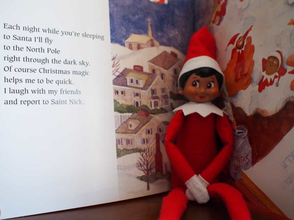 Elf on a Shelf comes with a rhyming book that explain how Santa uses Scout Elves to keep an eye on boys and girls. One morning, the elf could be reading the book.