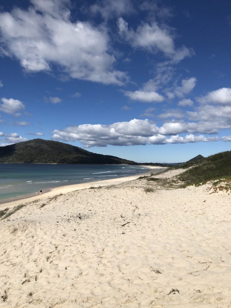 We headed down the dirt Beach Road, where you can climb over the sand dune at the end and be rewarded with the beautiful view of Hawks Nest beach and Mount Yacaaba.