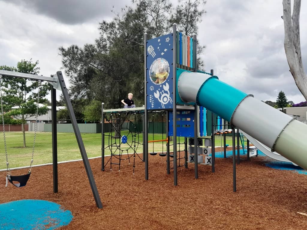 When it’s time for a swing, there’s a selection to suit all ages. Kids can choose from a regular swing or a group swing and there’s also a baby/toddler swing. The base of the playground is a mixture of softfall and woodchip.