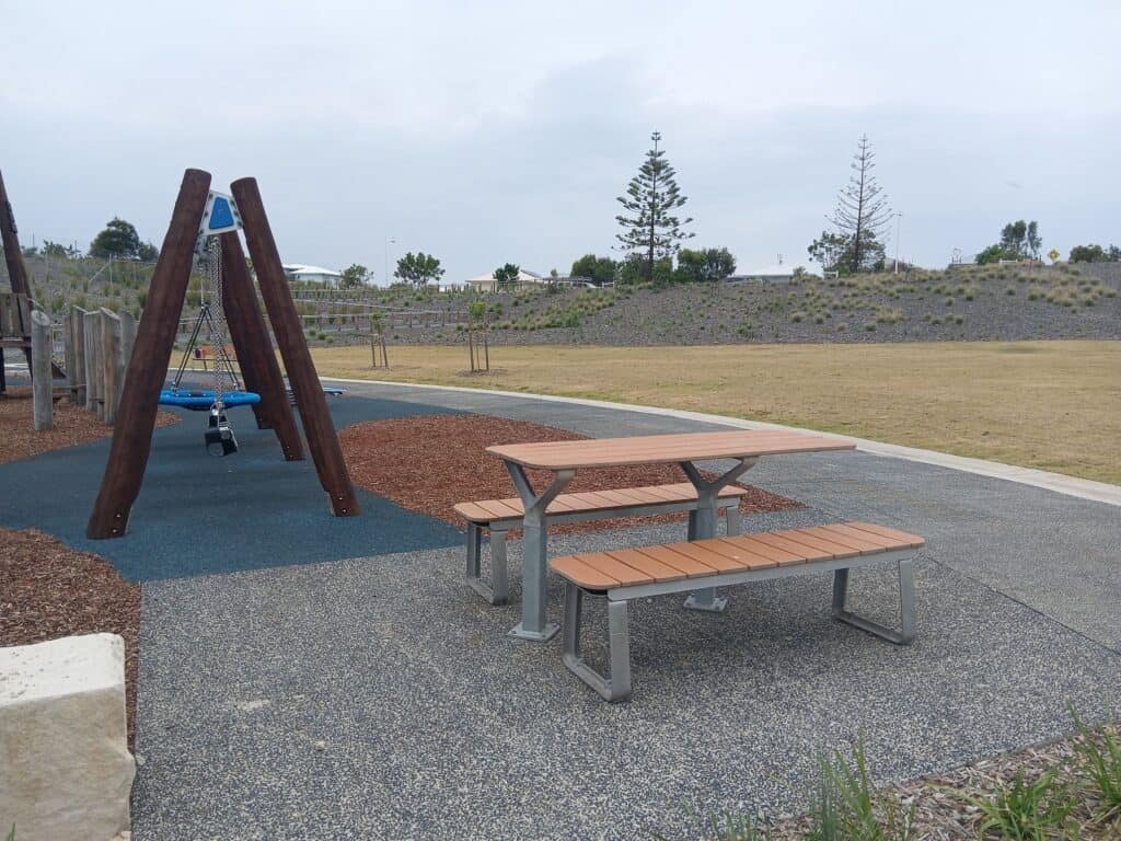 There’s ample seating around the playground, in the form of a bench, a picnic bench and sandstone blocks. There’s also a water fountain and bins.