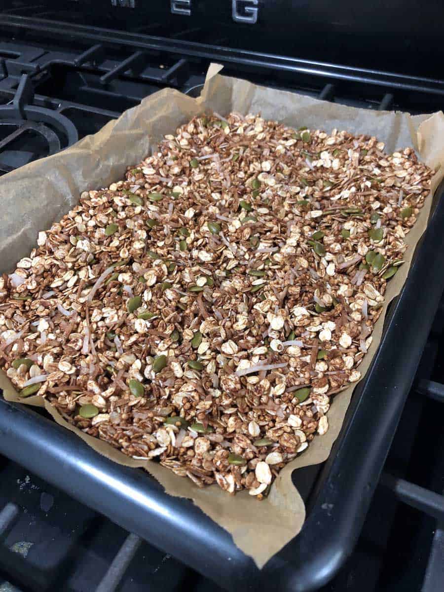 - Spread the mixture on a large, lined tray and bake in the oven for 10minutes on 180 degrees.