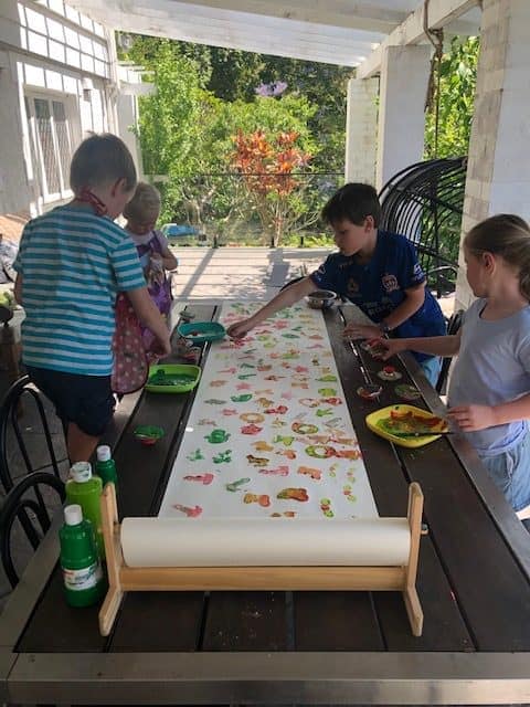 - Roll out the paper in the middle of the table and deck the kids out in aprons or painting smocks to protect their clothes.