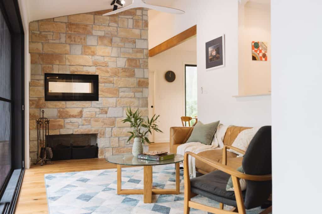Belmont North Project: The internal renovation involved replacing slate flooring with durable hardwood, leading to a stone-clad double-sided feature fireplace. A full reclad in Innova Montage and Duragroove cladding was undertaken, which is suitable for up to a BAL 40 fire rating and perfect for a home in the Australian bush. All windows and doors were updated to energy-efficient models.