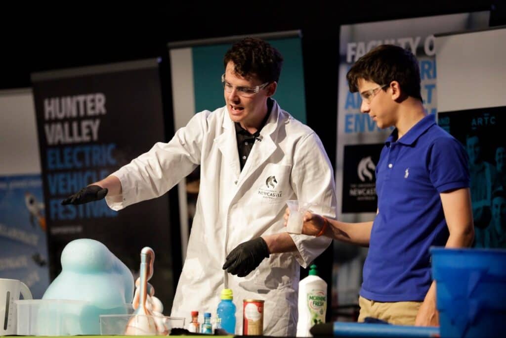 Join the University of Newcastle’s SMART team for a 50-minute science spectacular. From freezing objects with liquid nitrogen to creating air-powered rocket launches and bubble explosions, this show is packed with hands-on science that will wow young minds.