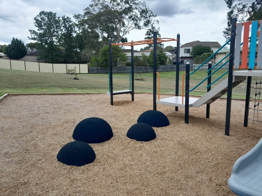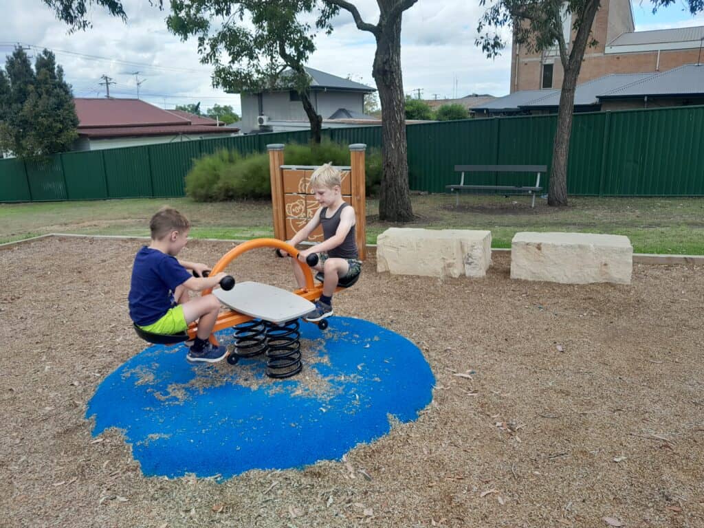 Parents and carers can sit and supervise from the park bench or from the sandstone blocks. There are a few tall trees, providing a small amount of shade and younger trees have been planted around the park.
