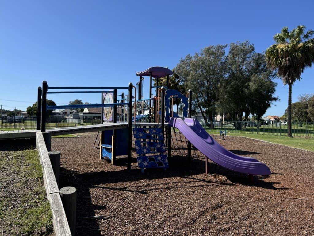 It features a fully-fenced playground with play equipment catering to a range of ages.