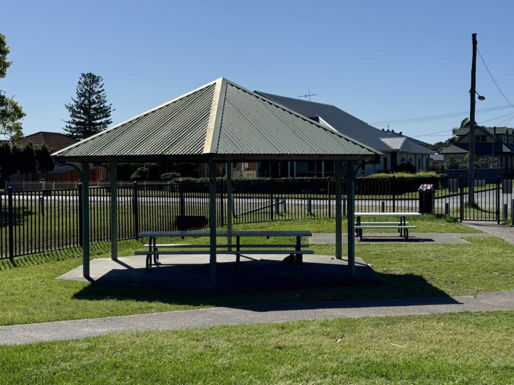 There’s covered seating area within the fenced playground area.