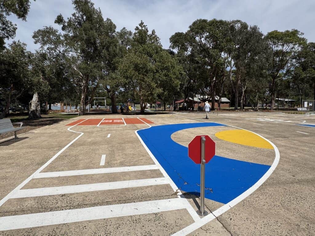 The scooter track at Lake Macquarie Variety Playground is popular with kids on both bikes and scooters. The large track located at the back (western end) of the playground features ‘roads’ complete with road crossings, road signs, obstacles and roundabouts. There is a great, raised ‘refueling station’ where they can ‘fill up’ before heading down the ramp and back onto the track.