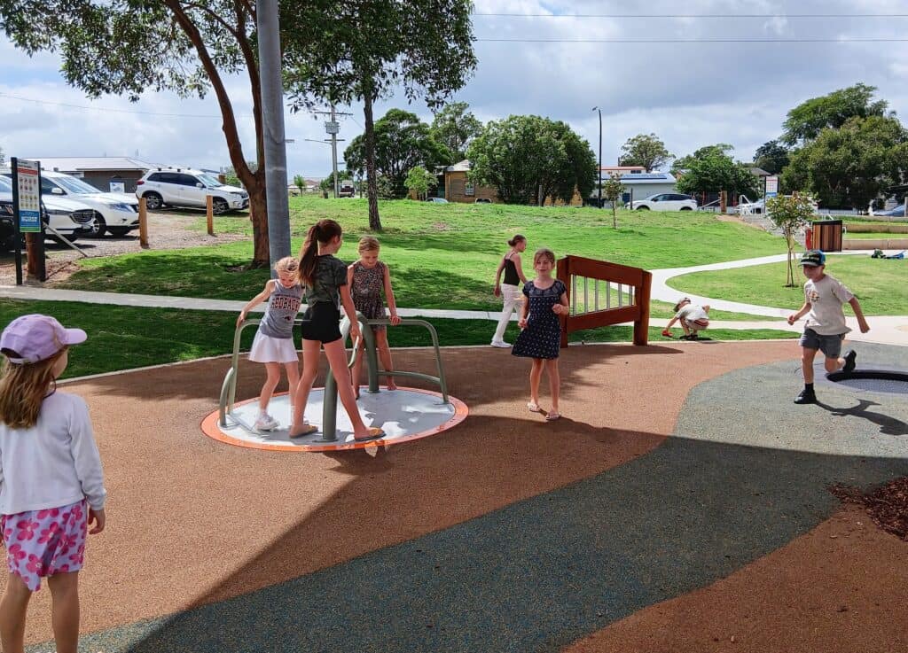Under the large shade sail, there are swings, including a baby/toddler swing, a regular swing and a group swing for older kids to pile on to together. There’s also an inground mini trampoline and an accessible roundabout. The surface in this area is a combination of soft fall and woodchip.