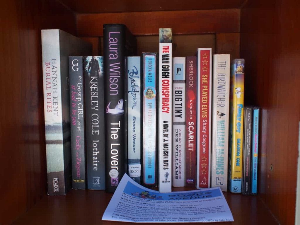 With a primary school age son, Margaret and Geoff have filled their library with both adult and kids books and advise that anyone can contribute or take books. Occasionally there may be DVDs and CDs donated.