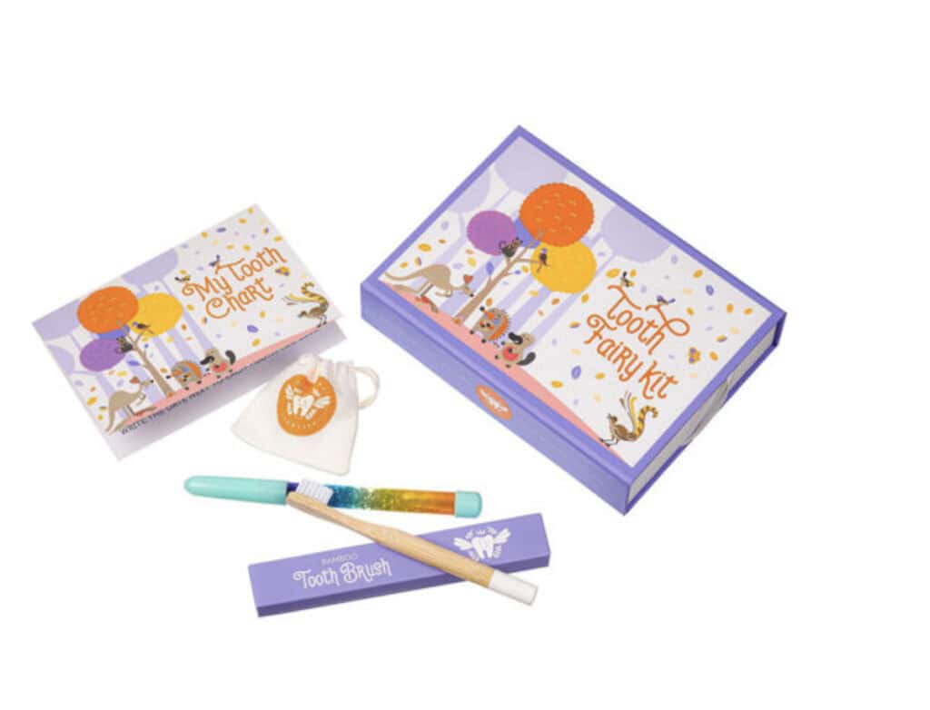 The kit contains a special $2 coin featuring the Tooth Fairy, a bamboo toothbrush, a floating glitter fairy pen, a tooth chart (so handy to keep track),