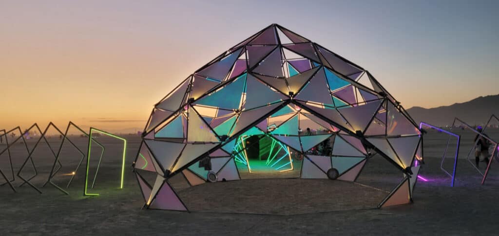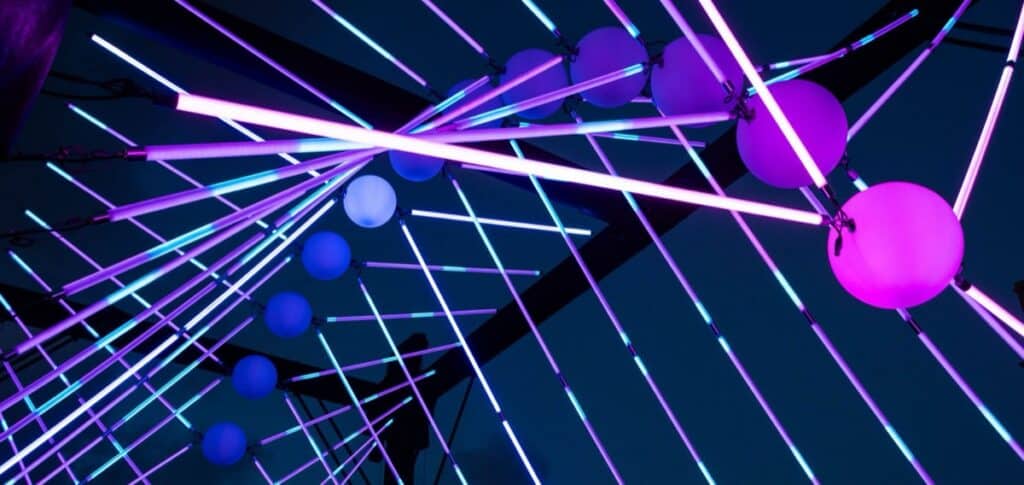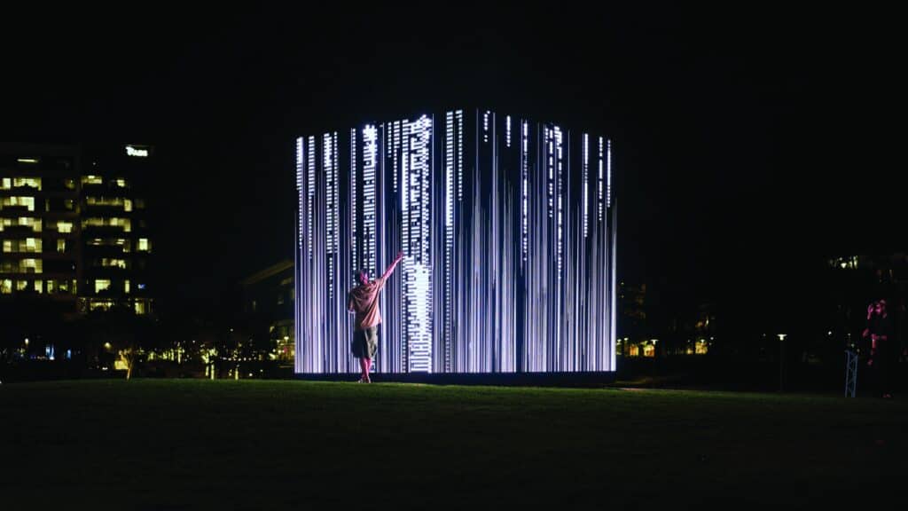 Enter the AI mainframe with Voxelevated, an archway of light, knowledge and power that is equal parts awe-inspiring and ominous. Journey through a glowing grid with LED cubes – or voxels, the 3D equivalent of pixels – suspended in mid-air and moving in-sync with a soundtrack reminiscent of a glitchy hymn.