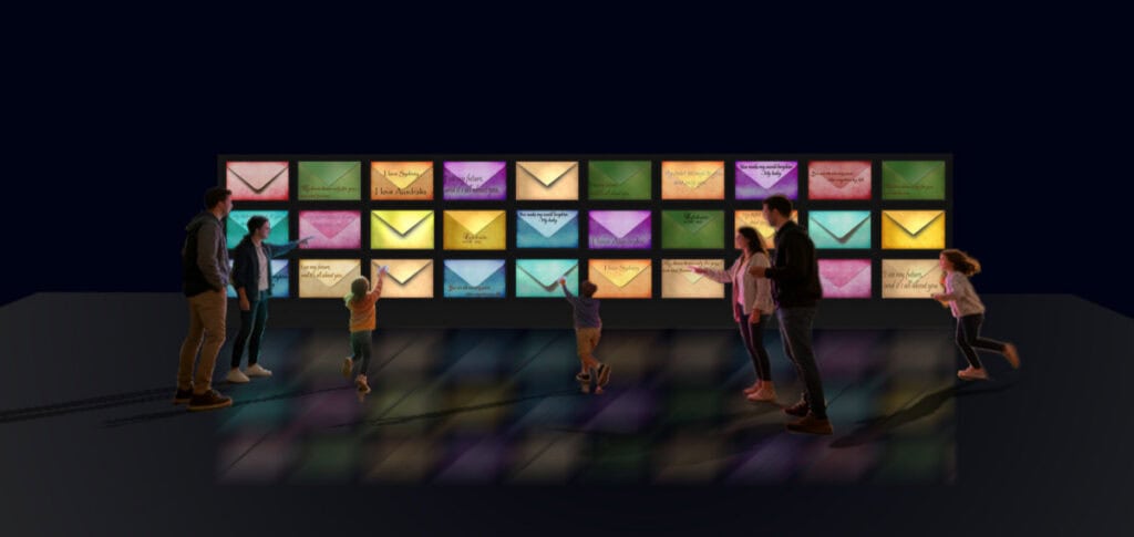 Letter is a digital whisper-chain, a 10-metre-long wall made of 30 waterproof touchscreens, each showing a sealed envelope. Which one is calling you? Tap it to discover a secret letter or drawing from a previous visitor, then leave a note or scribble of your own.