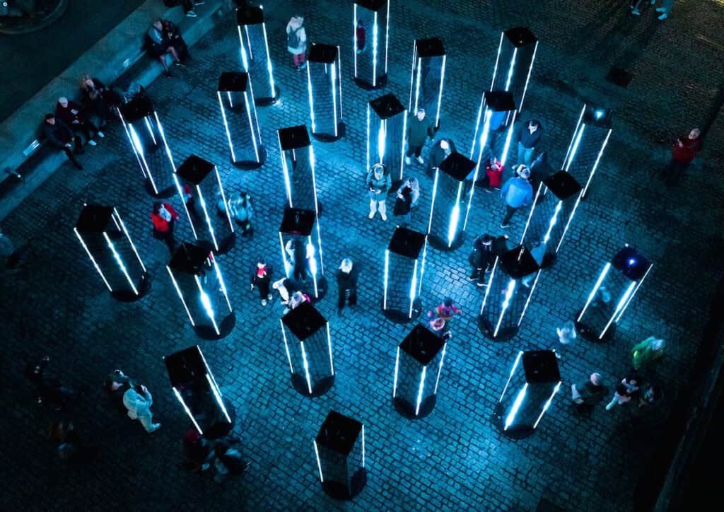 The most popular part of the festival. Buildings, streets and public spaces are transformed with colourful projections, illuminated sculptures and interactive artworks.
