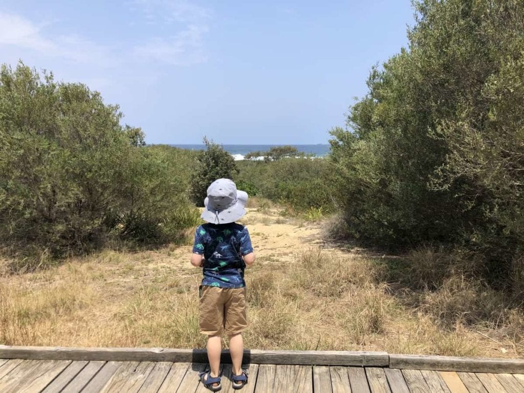 There’s lots to look at here – keep an eye out for birds, lizards and of course beautiful ocean views. There is so much space to play and run around here, and there are stunning views north to the headland, and south along Nine Mile Beach.